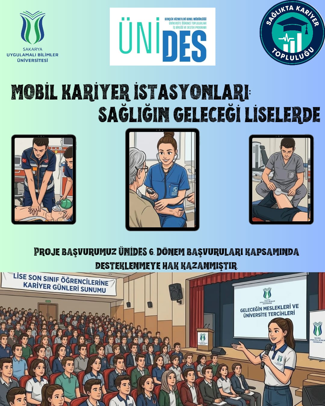 Sakarya Uygulamalı Bilimler Üniversitesi Sağlık Bilimleri Fakültesi bünyesinde faaliyet gösteren Sağlıkta Kariyer Topluluğunun “Mobil Kariyer İstasyonları: Sağlığın Geleceği Liselerde” projesi, Gençlik Hizmetleri Genel Müdürlüğü tarafından yürütülen Üniversite Öğrenci Toplulukları İş Birliği ve Destek Programı (ÜNİDES) 6. Dönem başvuruları kapsamında desteklenmeye hak kazanmıştır. Bu proje kapsamında liselerde kurulacak mobil kariyer istasyonları ile sağlık alanındaki meslekler tanıtılacak, lise öğrencilerinin meslek seçimi süreçlerine katkı sağlanacak ve üniversite tercihleri konusunda farkındalık oluşturulacaktır.